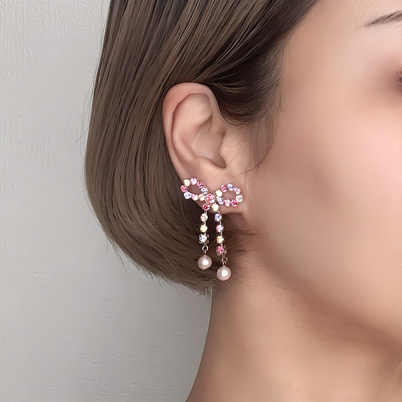 MAKI NUMOTOらしい心踊る配色のリボンとやわらかいパールの組み合わせが、コーディネートを華やかに女性らしくしてくれます✨
