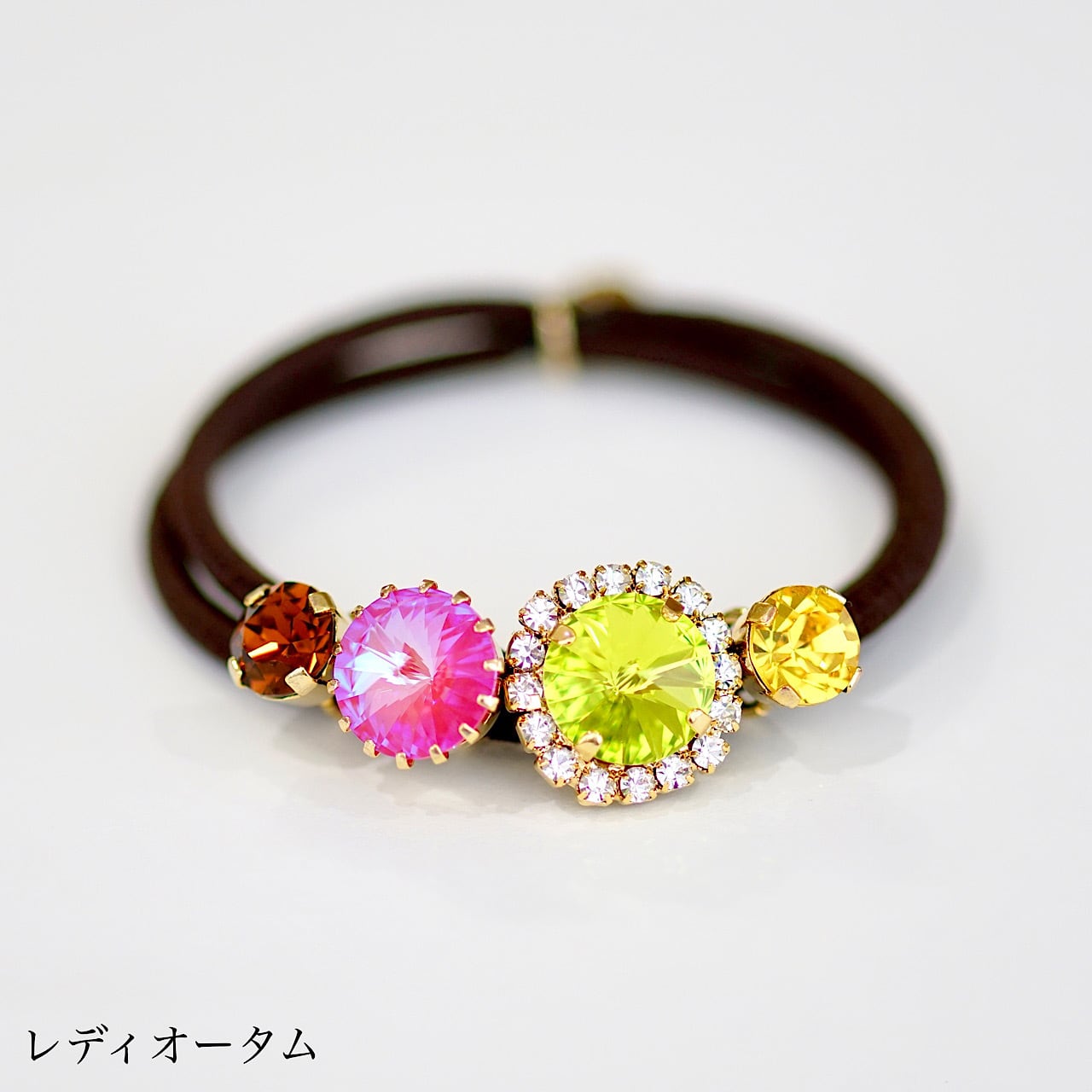 スワロフスキー:(左から順に) スモークトパーズ、ロータスピンクディライト、シトラスグリーン、ライトトパーズ