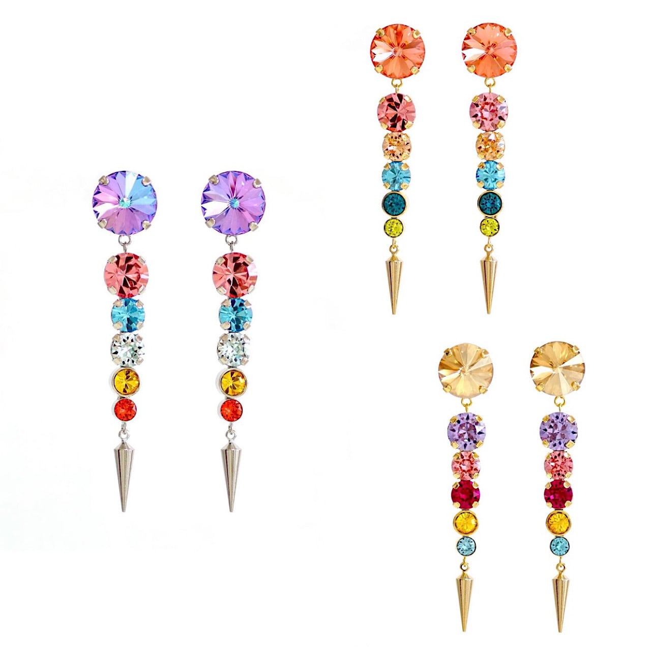 クリスタルガラス:(上から)ゴールデンシャドー、バイオレット、ライトローズ、フィッシャー、ライトターコイズ、アクアマリン
