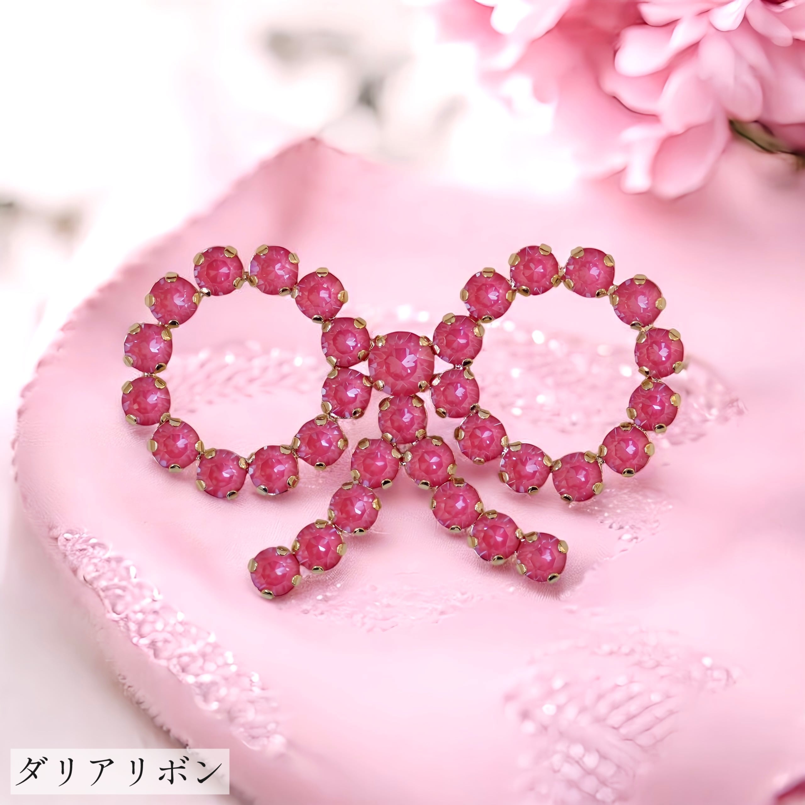 MAKI NUMOTOオリジナルのリボンの形を輝きの美しいクリスタルガラスで彩ったピンブローチ。